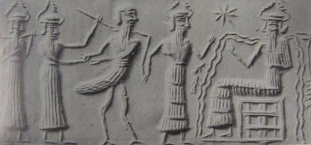 Il dio Enki in trono sulla destra