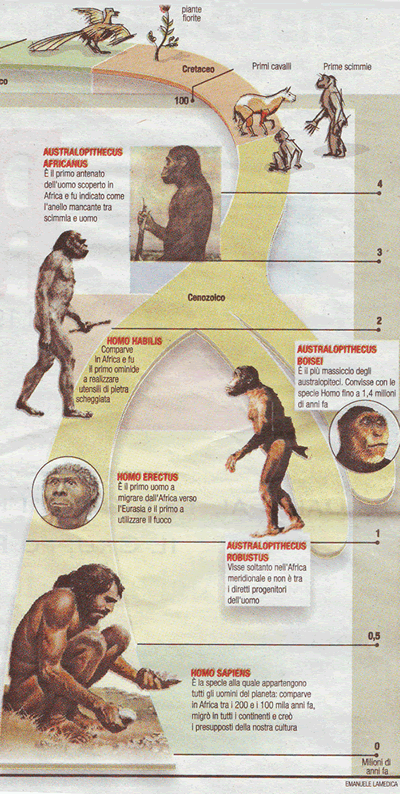 E’ ormai accettatala teoria secondo cui l’uomo si è sviluppato a partire da specie animali precedenti per via di un processo di evoluzione.